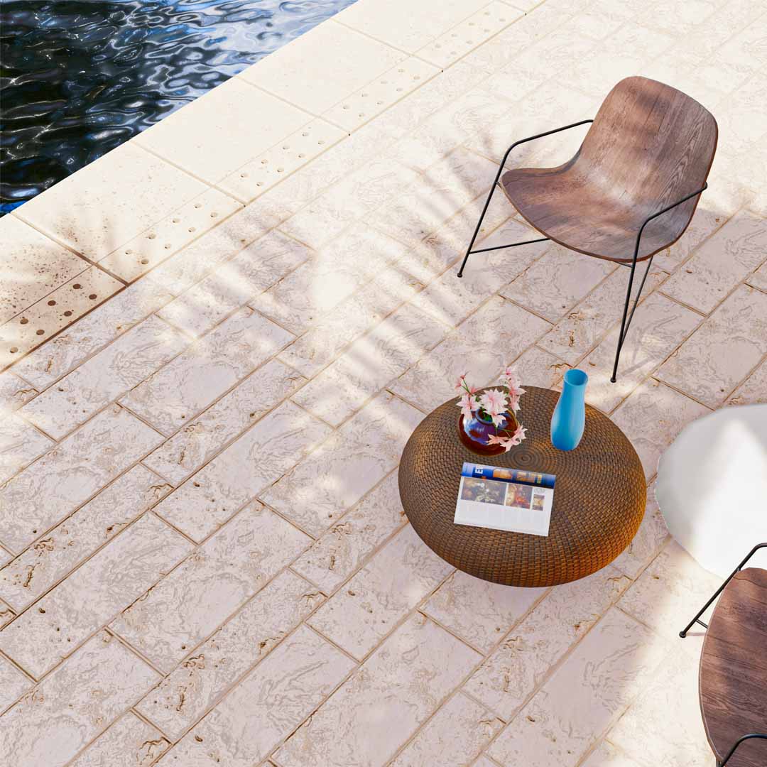Piso para playas y entornos de pisicinas, fabricado con materiales atérmicos y alto coeficiente de fricción.
